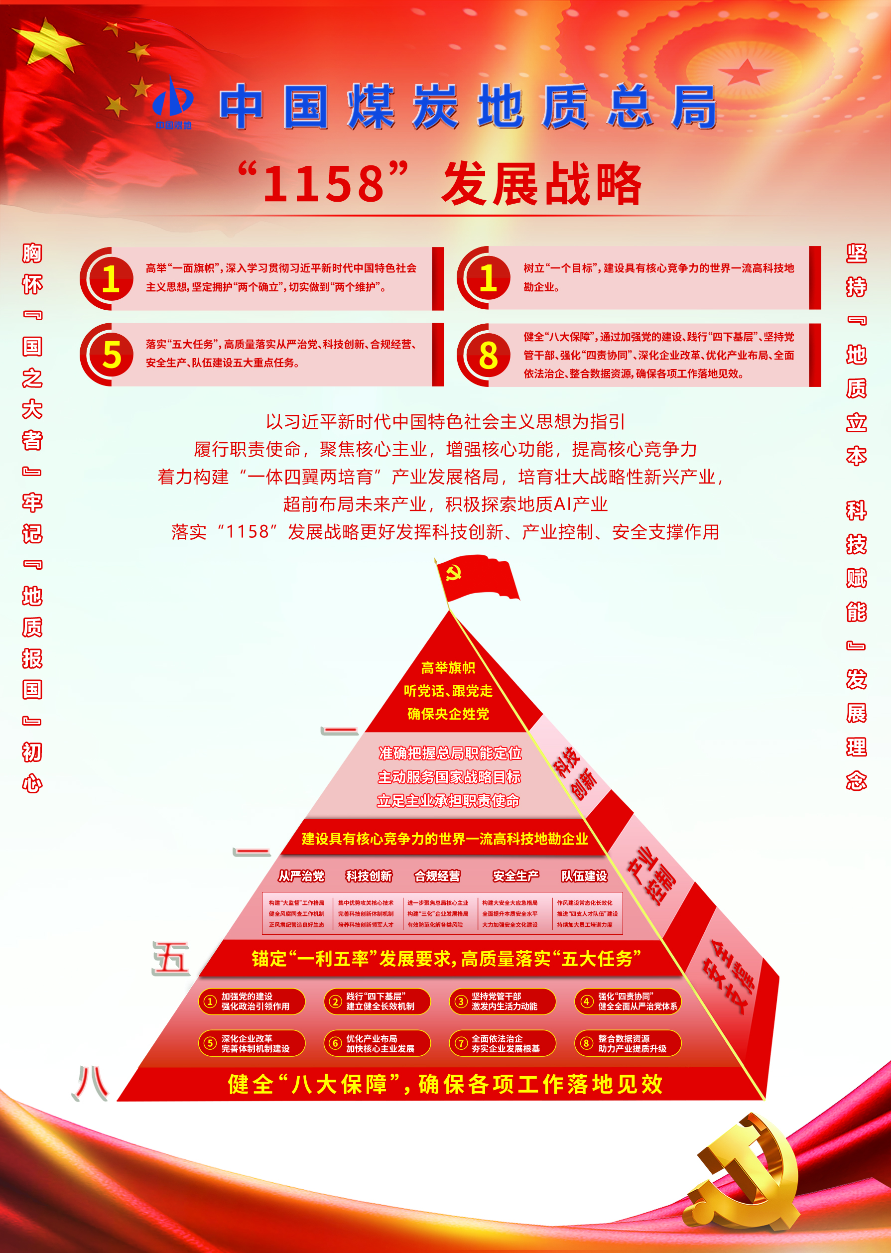 高举“一面旗帜”:深入学习贯彻习近平新时代中国特色社会主义思想,坚定拥护“两个确立”,切实做到“两个维护”。树立“一个目标”:建设具有核心竞争力的世界一流高科技地勘企业。落实“五大任务”:高质量落实从严治党,科技创新、合规经营、安全生产、队伍建设五大重点任务。健全“八大保障”:通过加强党的建设,践行“四下基层”、坚...
