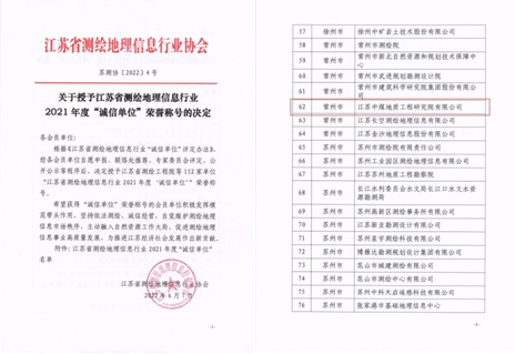近日,江苏省测绘地理信息行业协会公布了2021年度“诚信单位”荣誉称号企业名单,江苏局地研院再次成功入围。据悉,常州地区仅7家单位榜上有名。一直以来,地研院高度重视公司诚信建设工作,严格遵守行业法规、市场规范和技术法规。此次获评“诚信单位”荣誉称号,体现了行业对地研院测绘水平和质量的高度认可。公司将珍惜荣誉,持续开拓...