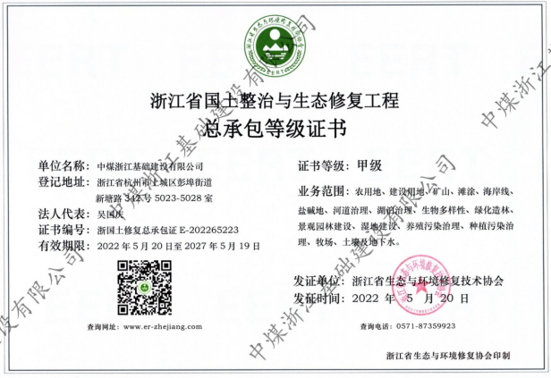 近日,中煤浙江基础建设有限公司成功取得浙江省生态与环境修复技术协会颁发的浙江省国土整治与生态修复工程总承包甲级资质、专项设计两项甲级资质。资质的取得将进一步拓宽中煤浙江基础公司业务范围和资质体系,为实现转型升级、推动企业高质量发展奠定坚实基础。