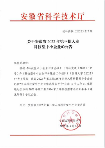 近日,安徽省科学技术厅公示了2022年第三批入库科技型中小企业名单,地下空间中煤(安徽)城市科技发展有限公司成功入库。科技型中小企业评价是国家科技部火炬中心计划之一,入库企业将在税收减免、财政支持等方面得到政府的大力支持。此次成功入库科技型中小企业,标志着城市科技公司在科技创新、自主研发和知识产权成果转化等方面得到...