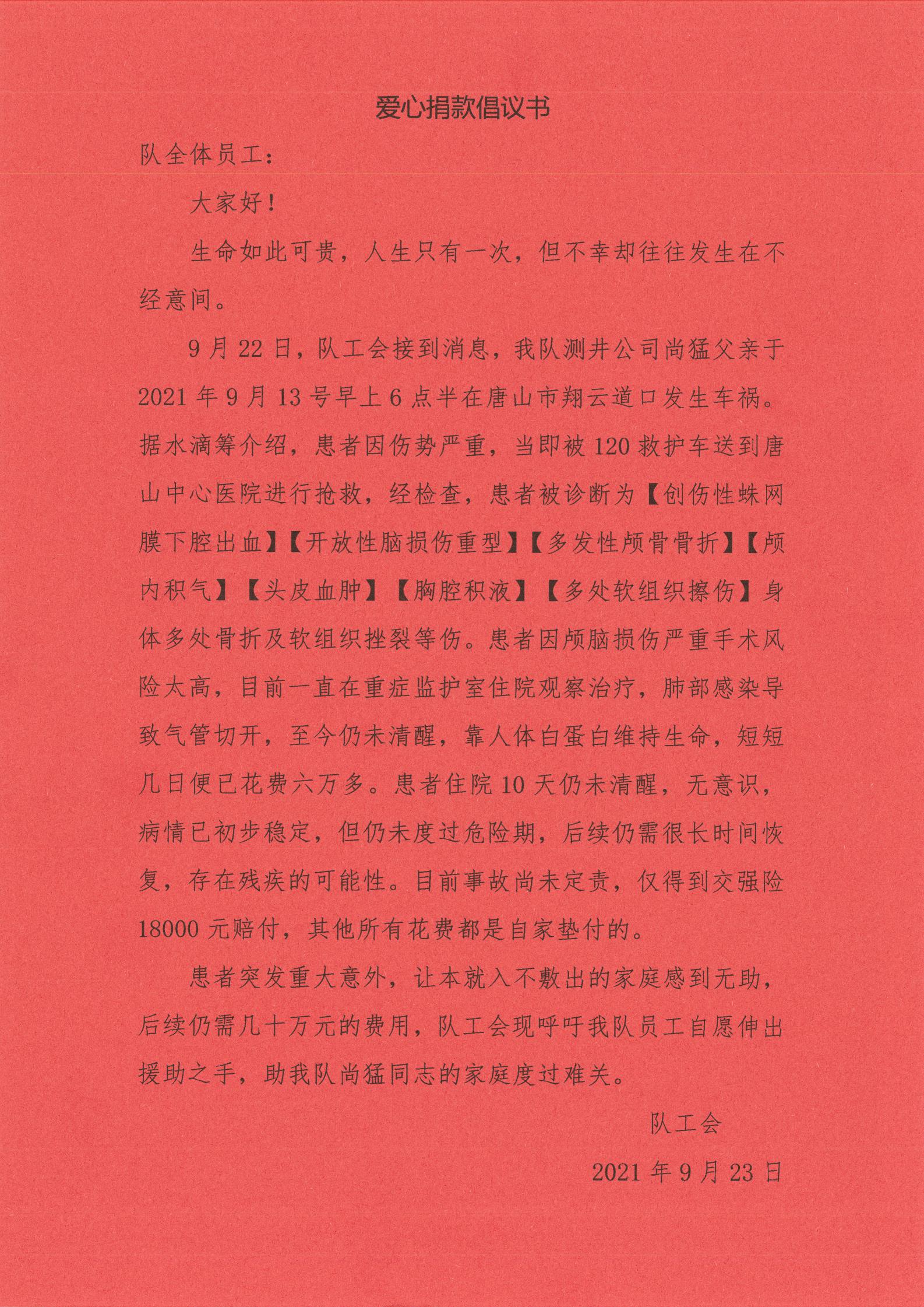天有不测风云,人有旦夕祸福。9月13日,水文局一队一名职工的父亲突遭重大车祸,被紧急送往医院重症监护室抢救,并被告知急需手术。大额医疗费用给这个本不富裕的家庭带来了难以承受的经济压力。水文局一队工会第一时间发起...